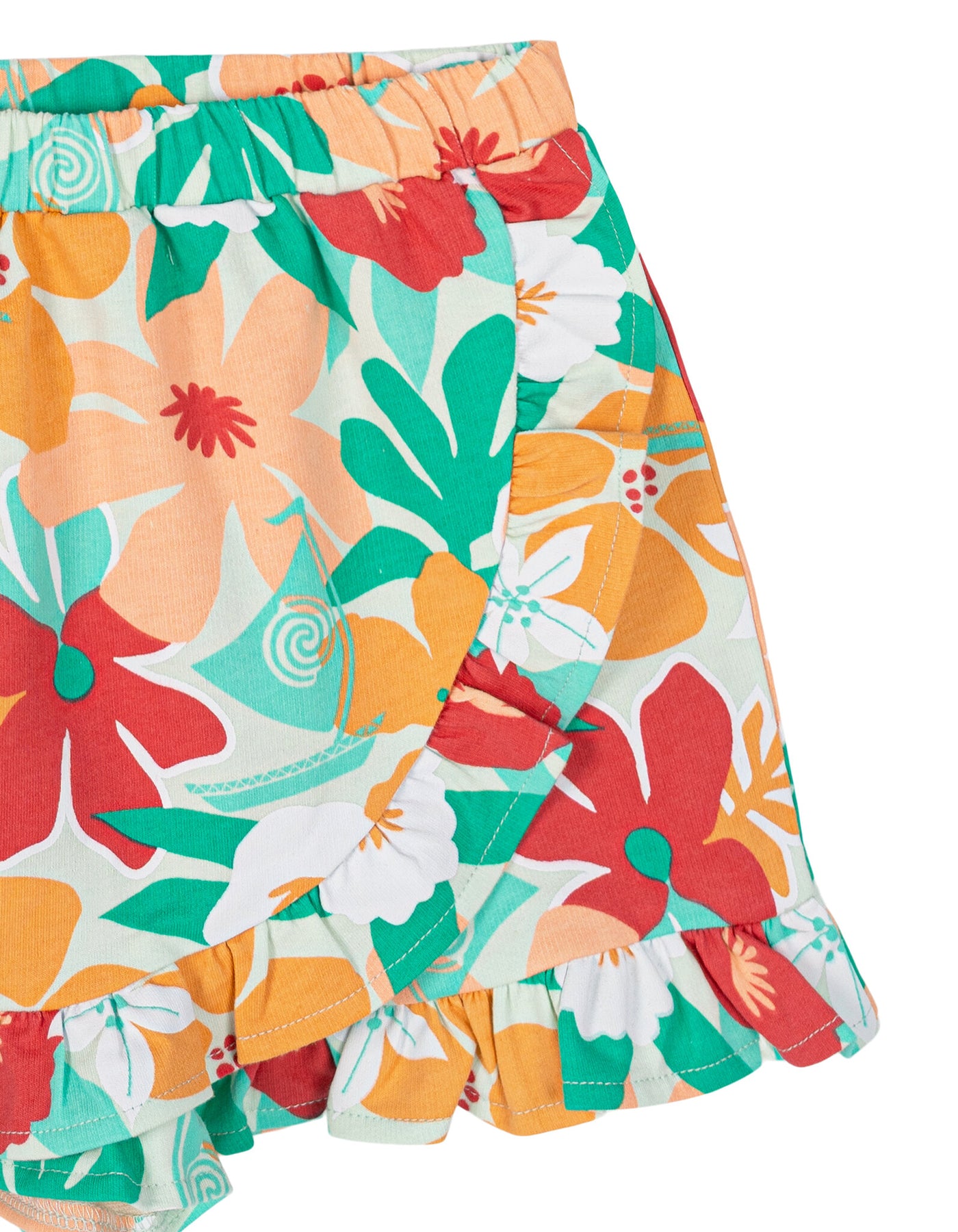 - All over print design; Rib knit crew neck collar; Awesome screen print artwork; Cute and stylish flutter sleeves; Puffed 3D flower design; Cute wrap skirt with inner shorts; Pull on closure; Floral print; Ruffled trim