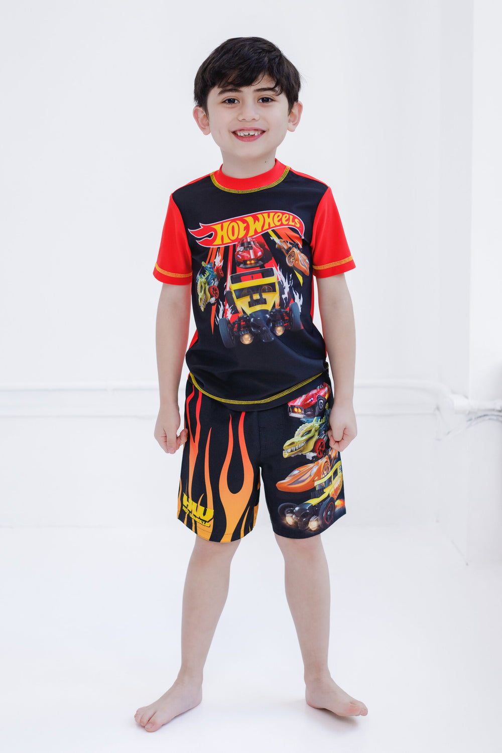 Hot Wheels UPF 50+ Pullover Rash Guard and Swim Trunks Outfit Set Toddler to Big Kid