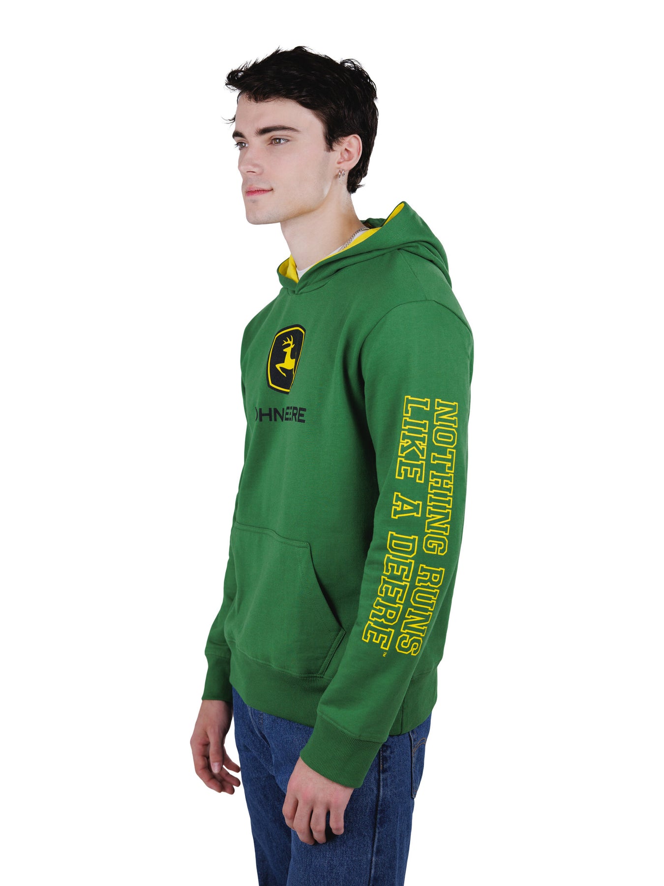 • Pull on closure; Ribbed sleeve cuffs and waist for a better fit; Comfortable hood lining; Soft hand screen print design; Sleeve art design with the words "Nothing Runs Like a Deere"; Comfortable and warm front kangaroo pocket; Kids and adult sizes for fun matching family outfits