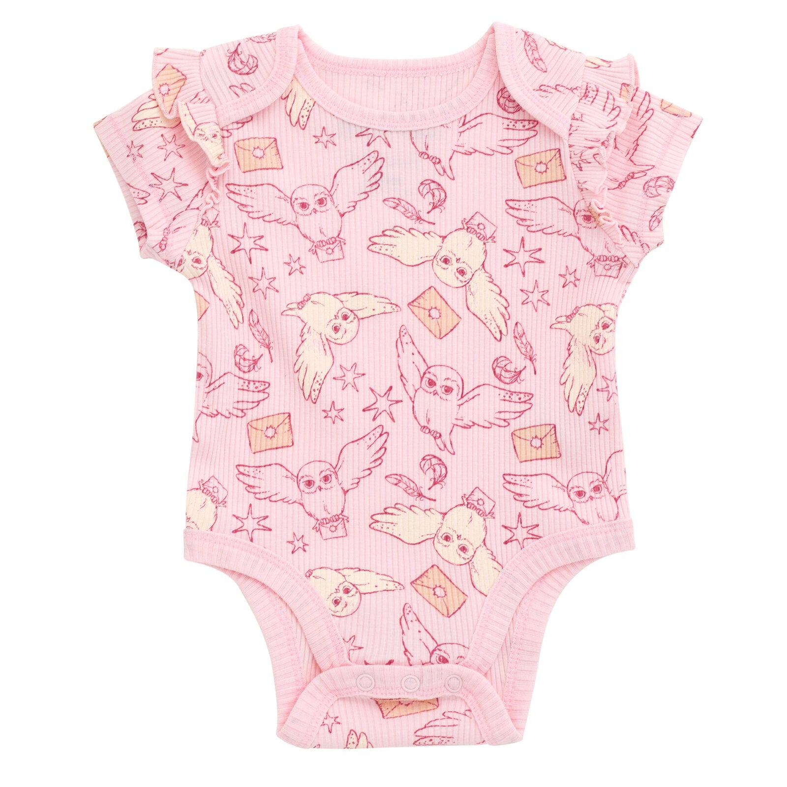 Dress your little girl in this adorable Harry Potter 3-piece outfit and get ready for a magical day! This stylish short sleeve creeper and shorts set comes with a matching elastic bow headband and features an easy-to-dress design, pretty ruffles on the sleeves, a bow on the shorts waist, and cute all-over print artwork of Hedwig the owl and letters for Hogwarts! Made of a soft rib knit material that keeps your little one comfortable, this fashionable Harry Potter baby clothing set is perfect for all day adventure and play!