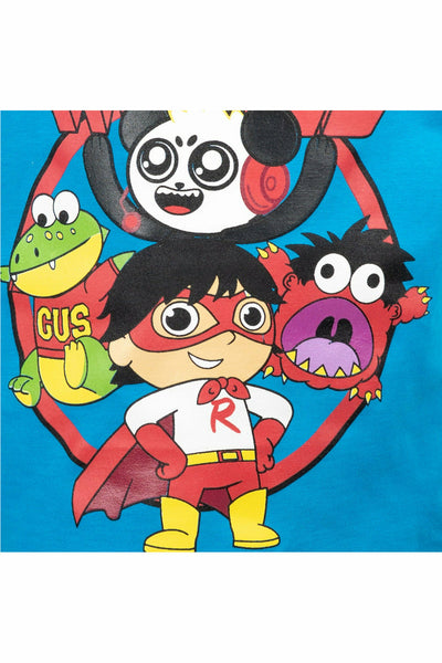 El atuendo favorito de su hijo con Red Titan Ryan, Combo Panda y Gus the frog con "Ryan's World" encima de ellos.