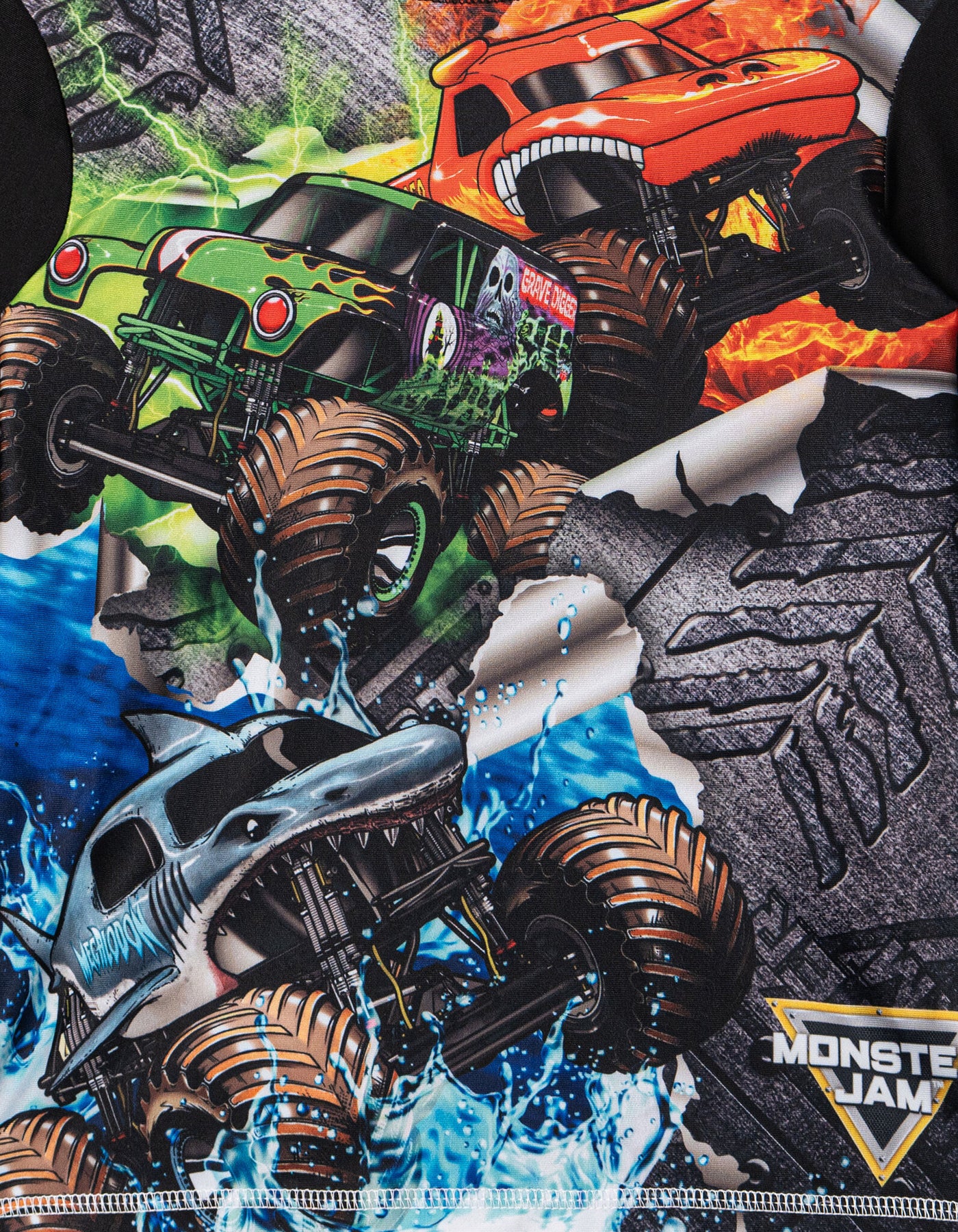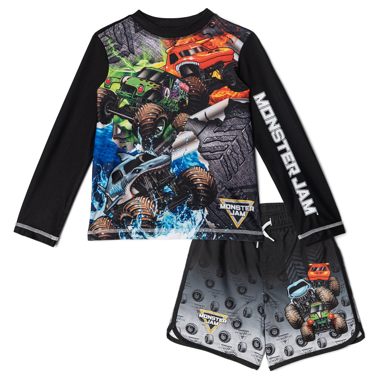 - Officially licensed Monster Jam Grave Digger El Toro Loco Megalodon toddler boys long sleeve swim shirt top and swimming shorts bottoms