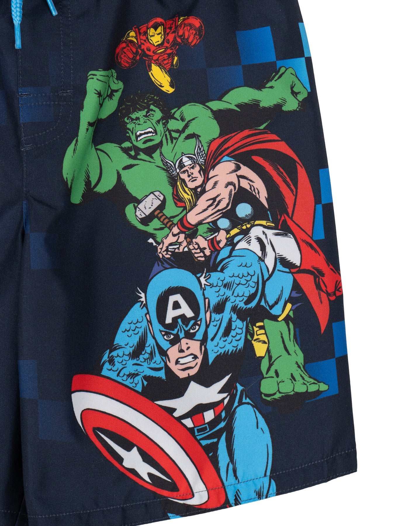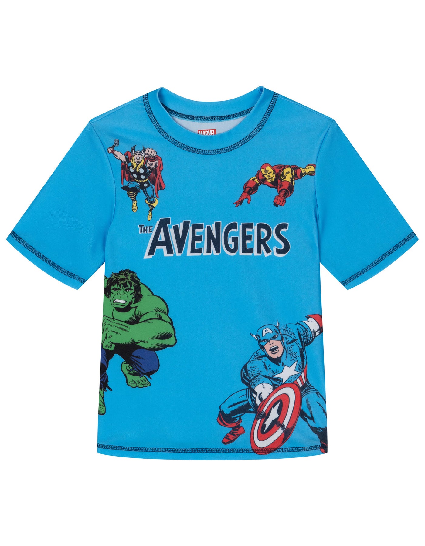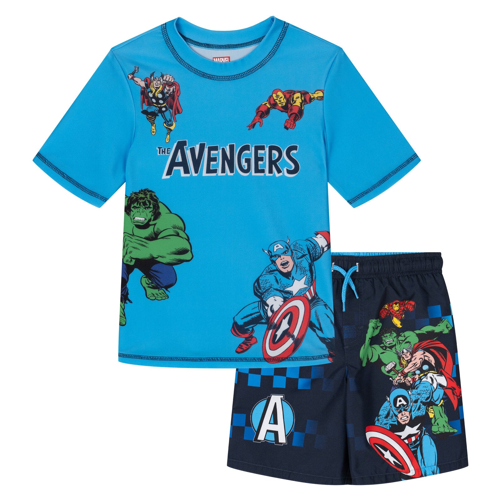 • Officially licensed Marvel Iron Man Thor Captain America Hulk toddler boys short sleeve swim shirt top and swimming shorts bottoms