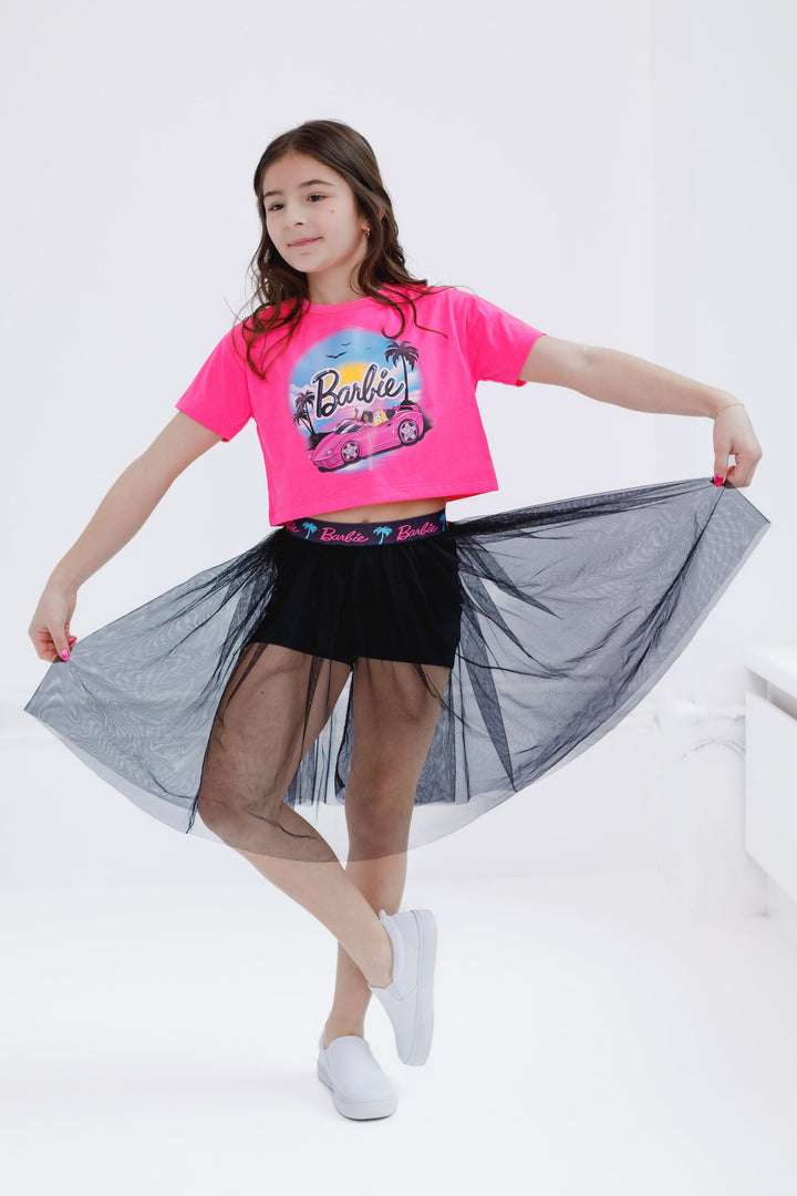 Get ready for an adventure in the Dreamhouse and embrace Barbie's amazing sense of style in this fashionable Barbie outfit! This cute short sleeve shirt and skort set features a pretty tulle ballerina skirt, cool crop top, and colorful Malibu Barbie artwork that your little girl will love to wear! Made of a soft material that keeps your fashionista comfortable, this stylish Barbie clothing set is the perfect outfit for all-day fun and play! BARBIE (R) and associated trademarks and trade dress are owned by, and used under license from, Mattel. (c) 2024 Mattel.