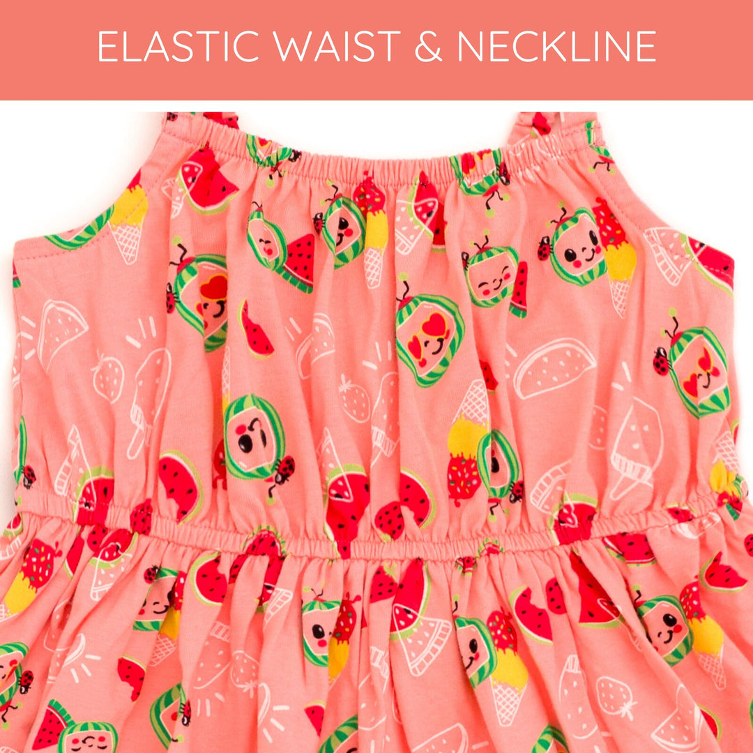 - All over print design; Spaghetti straps; Pull on closure; Cute and casual summer sundress; Elastic back and waist for a comfortable fit; Elastic neckline for easy dressing