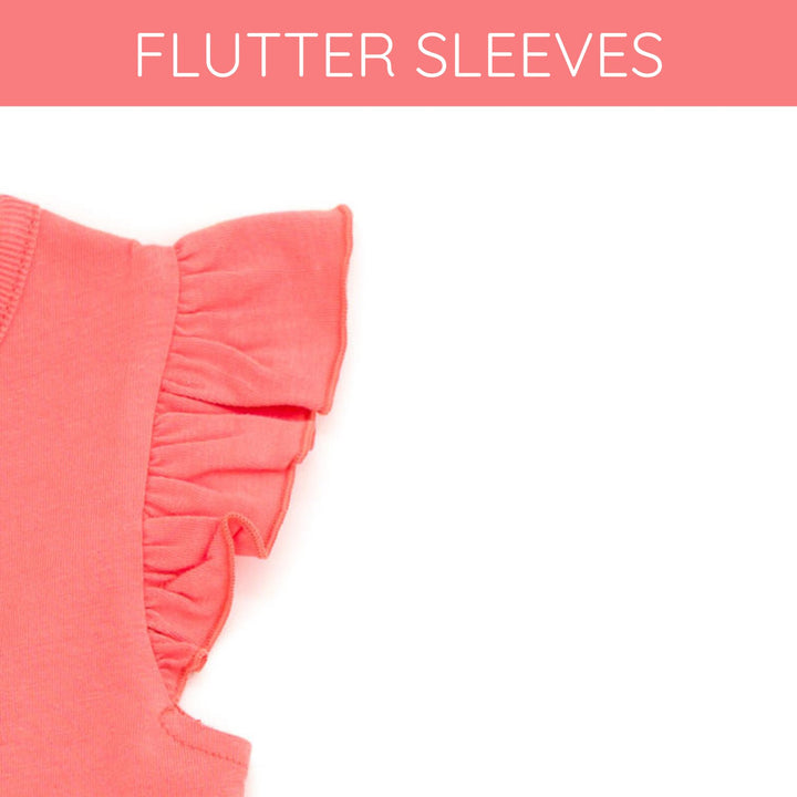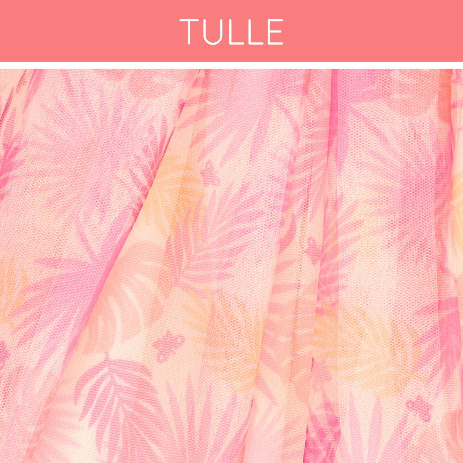 • Tulle skirt with a tropical leaf print and taffeta lining; Rib knit crew neck collar; Cute and stylish flutter sleeves; Soft hand screen print design; Pleated skirt design; Sparkly lurex elastic waistband; Pull on closure