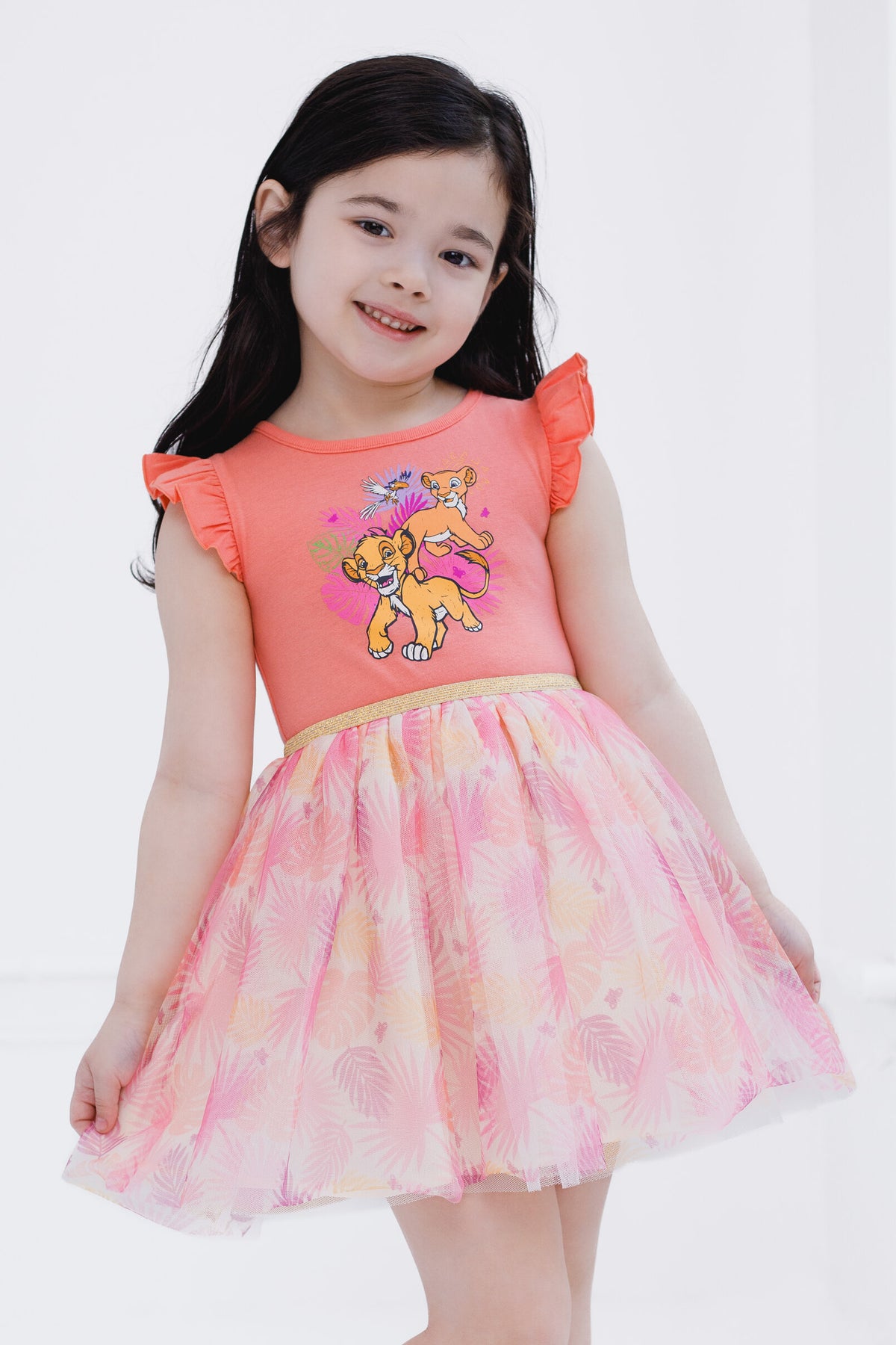 Get ready for a day filled with Disney magic in this cute Lion King tutu dress! This stylish sleeveless dress features a tulle ballerina skirt, pretty flutter sleeves, vibrant tropical leaf print, and fun artwork of Simba, Nala, and Zazu that your little girl will love to wear! Made of a soft material that keeps your child comfortable, this fashionable Disney dress is a fun party outfit and cool everyday look!