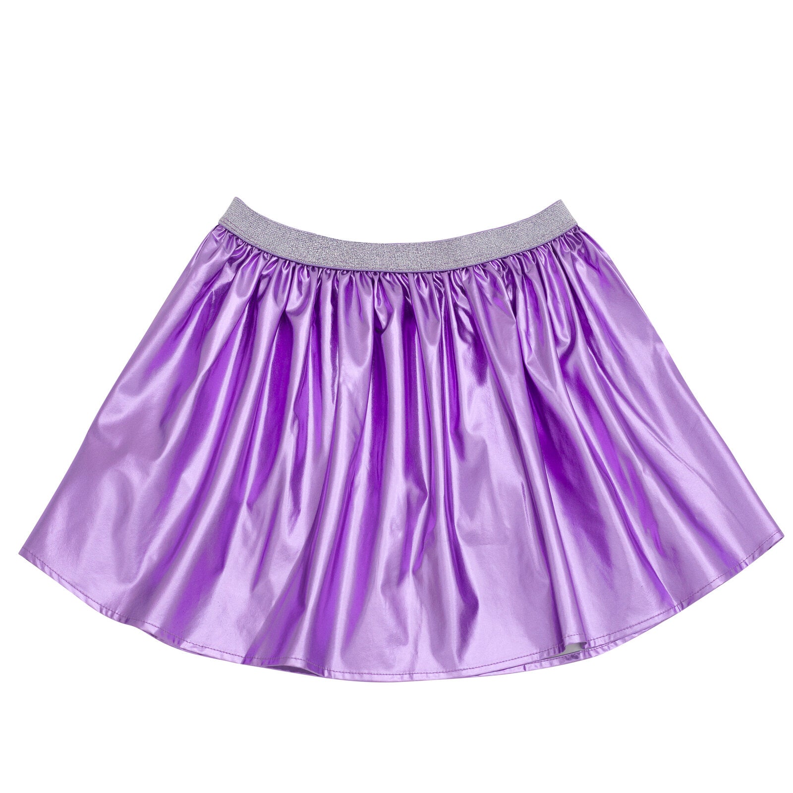 • All over print design; Fashionable ruffles on sleeves; Rib knit crew neck collar; Awesome screen print design with pink glitter and purple foil art; Sparkly lurex elastic waistband; Pull on closure; Metallic iridescent skirt