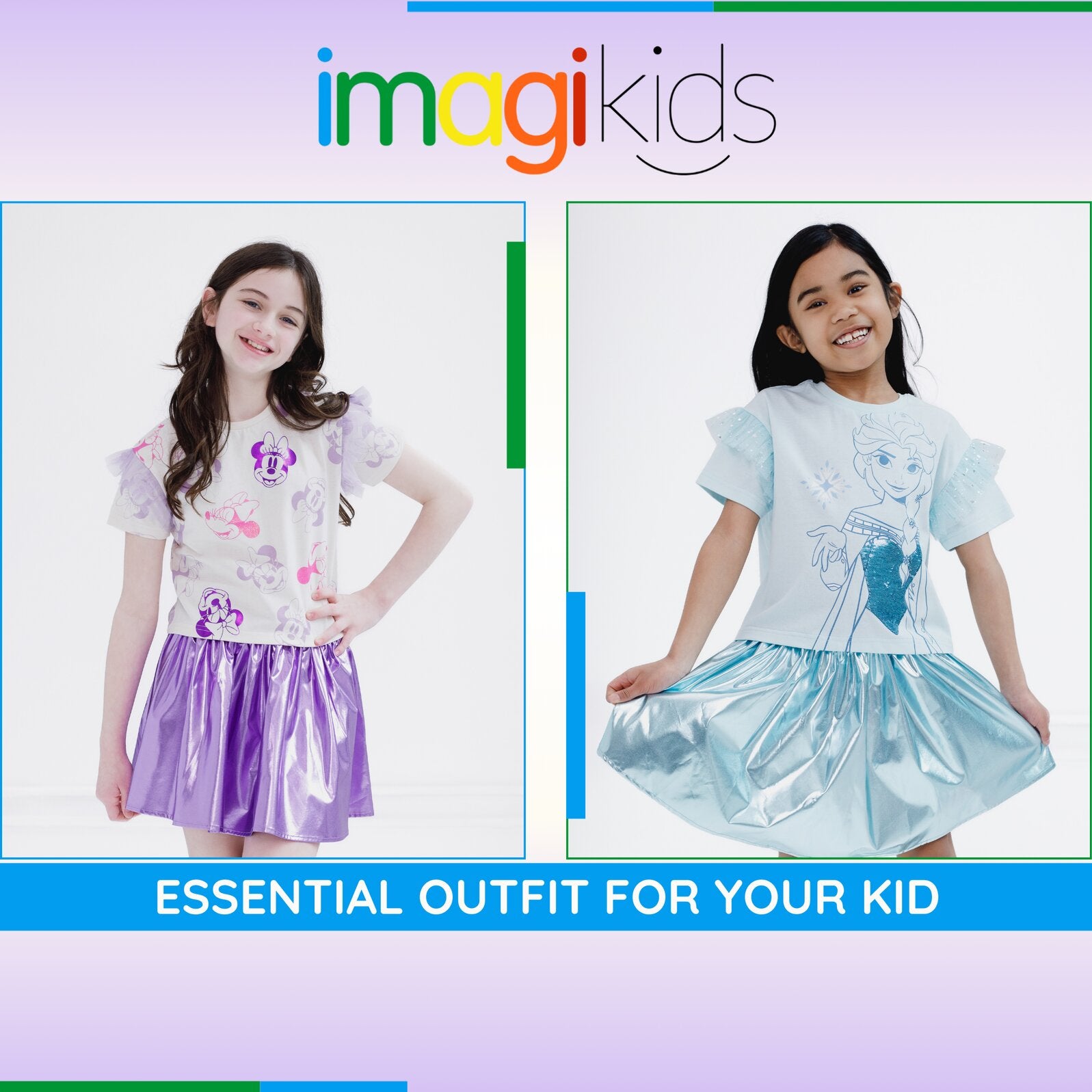 Get ready for a day filled with Disney magic with this comfy and stylish Disney outfit! This fashionable short sleeve tee and metallic skirt set features a cool iridescent color, pretty ruffles on the sleeves, and vibrant artwork that your Disney fan will love to wear! Choose from cute and iconic designs of Minnie Mouse or Elsa from Frozen. Made of a soft material that keeps your child comfortable all day long, this Disney clothing set is a fun spring and summer wardrobe essential!