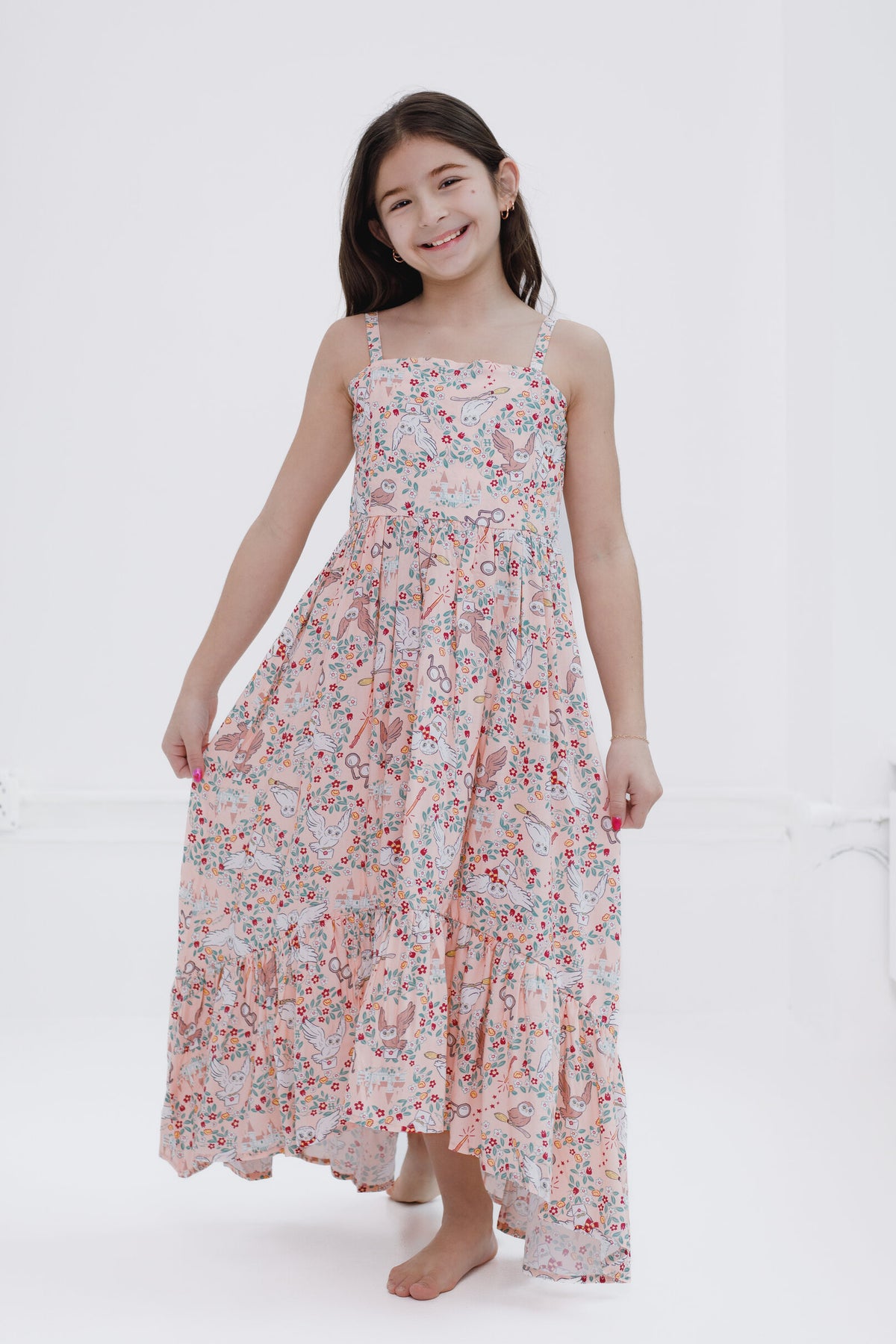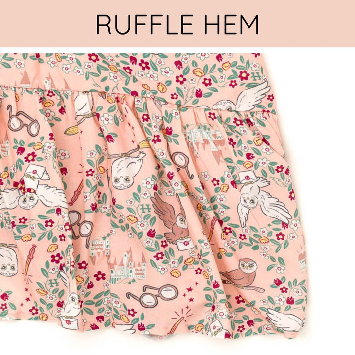 Your little witch is ready for a magical adventure at Hogwarts in this cute Harry Potter maxi dress! This fashionable sleeveless smocked dress features a pretty shirred ruffle hem, comfy cami spaghetti straps, and an adorable all-over print of Hedwig the owl, wands, Harry Potter's iconic glasses, and flowers that your little girl will love to wear! Made of a soft material that keeps your child comfortable all day long, this stylish Harry Potter sundress is the perfect spring and summer outfit!