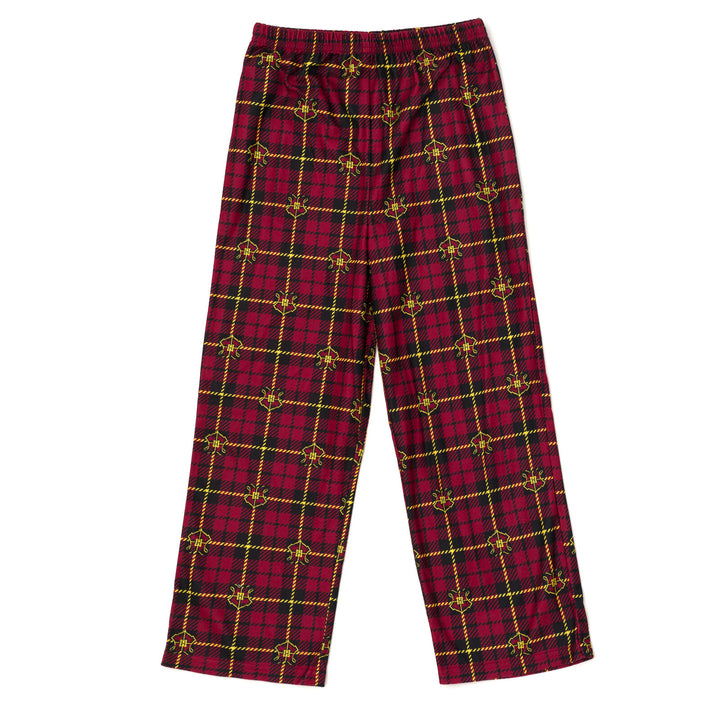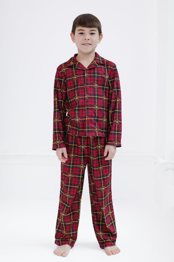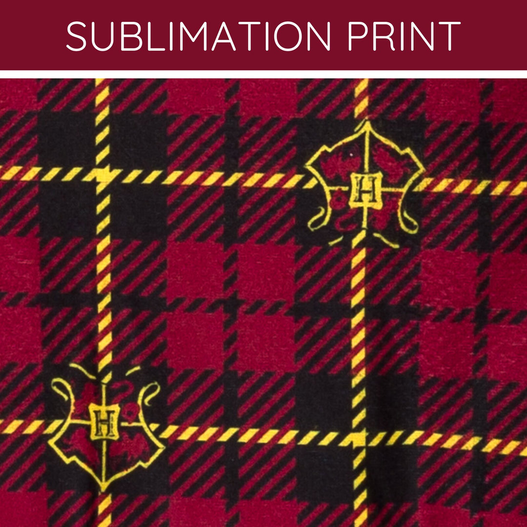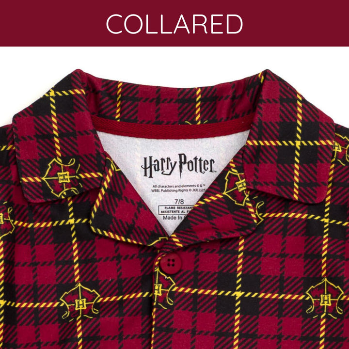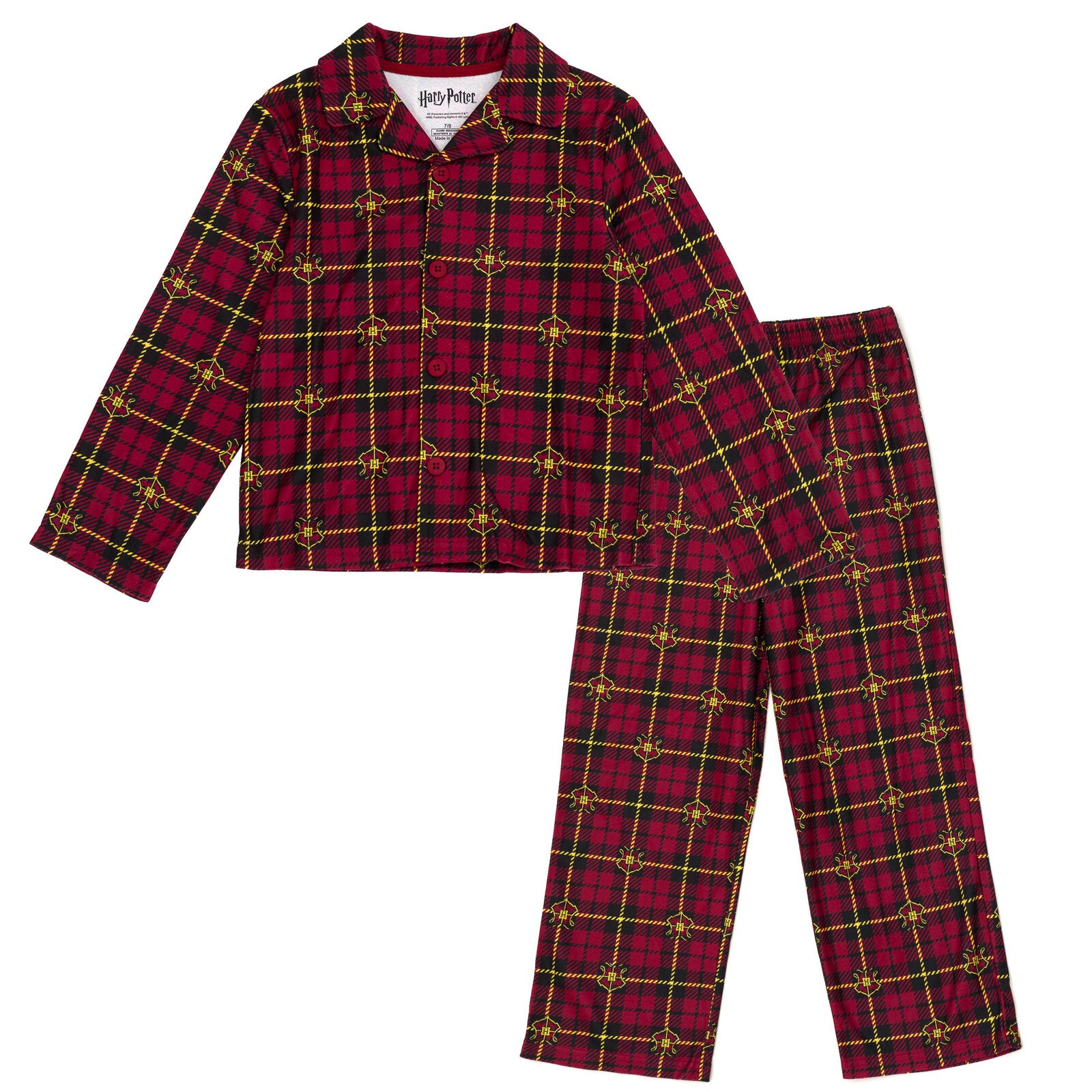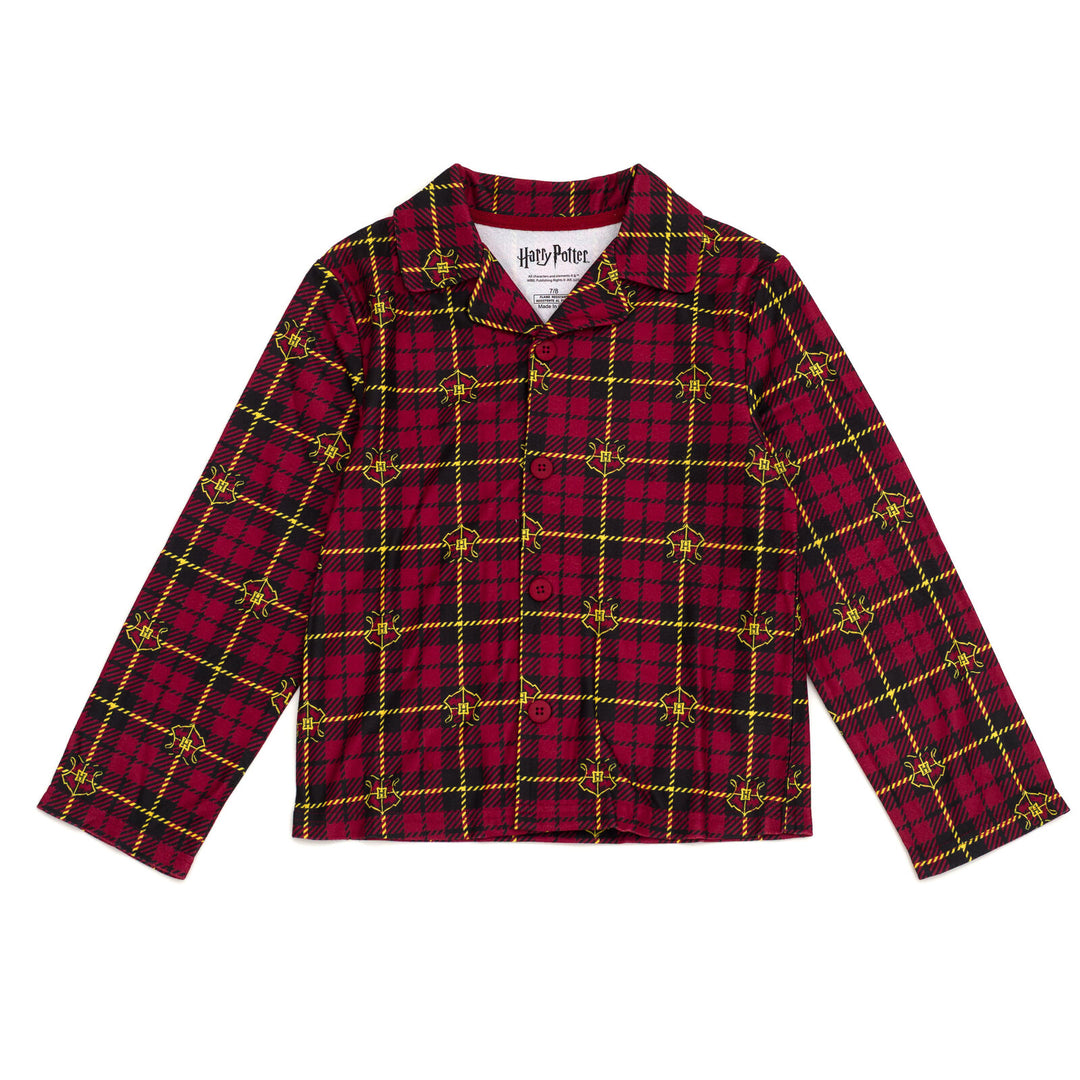 Get ready to join the wizarding world with this Harry Potter pajama set! Made for little kids to big kids, this sleep set includes a comfortable long sleeve button-down pajama shirt and matching pajama pants. The shirt and pants feature the iconic Gryffindor colors in a cool plaid pattern with a fun all-over print of the Hogwarts house crest. Perfect for lounging or sleeping, this set is a must-have for any Harry Potter fan. So grab your wand and get ready for a magical night in this cozy and stylish pj set.