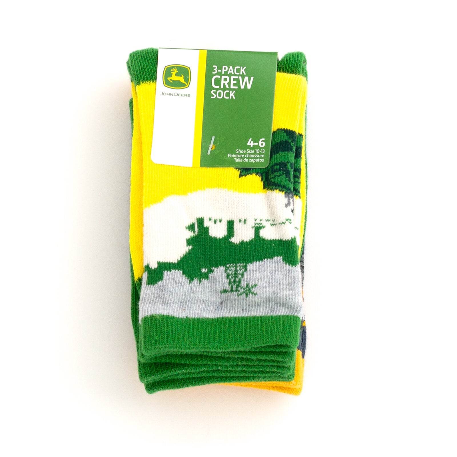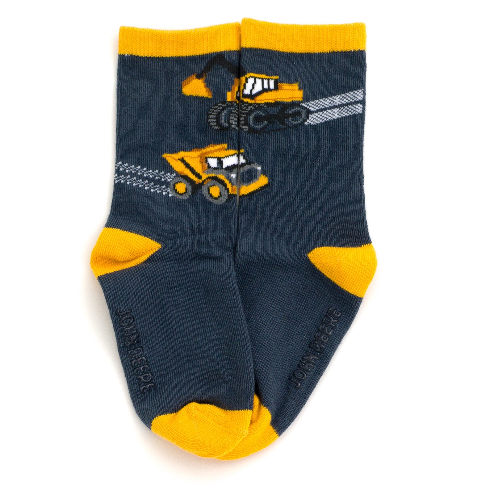 Get your little one ready for a day of play with these John Deere 3 Pack Crew Socks. Made for toddlers to little kids, these socks feature a fun and colorful design with images of construction trucks and tractors. The soft and stretchy material ensures a comfortable fit, while the crew length provides extra coverage and warmth. These socks are perfect for any little one who loves John Deere and construction vehicles. Add them to your child's wardrobe today!
