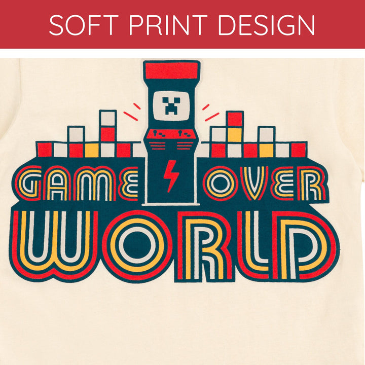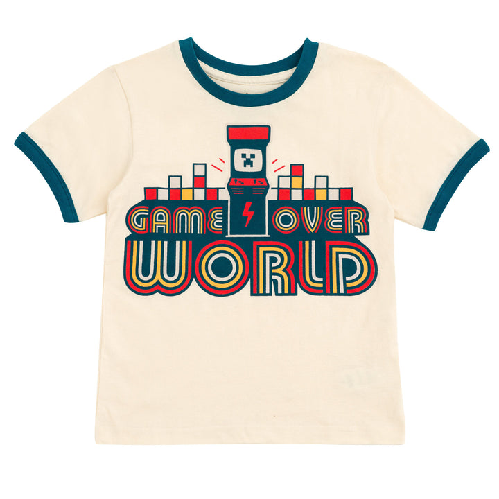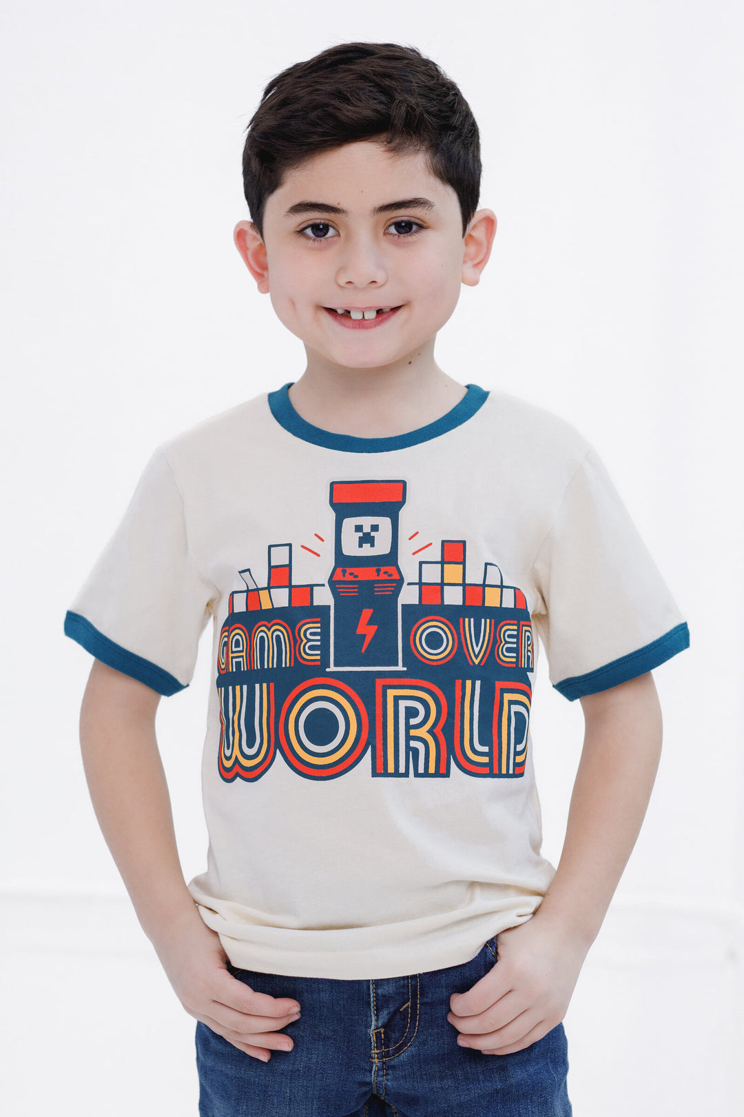 Welcome to the Overworld, where you can make anything you imagine! Your gamer is ready to join Steve on the adventure of a lifetime in this cute and comfy Minecraft ringer tee. This stylish short sleeve shirt features contrast trim on the collar and sleeves and cool graphic art from A Minecraft Movie with the words "Game Over World" that your Minecraft fan can't wait to wear! Made of soft 100% cotton for all day comfort, this fashionable Minecraft top is perfect for playing video games, watching their new favorite movie, and fun everyday wear!