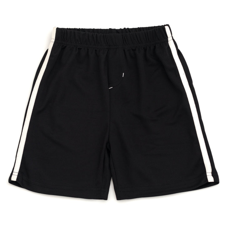 • Rib knit crew neck collar; Awesome screen print design; Contrast taping; Faux fly; Elastic waist for comfortable stretch and a better fit; Pull on closure; Stripe pattern design; Athletic and breathable mesh basketball shorts