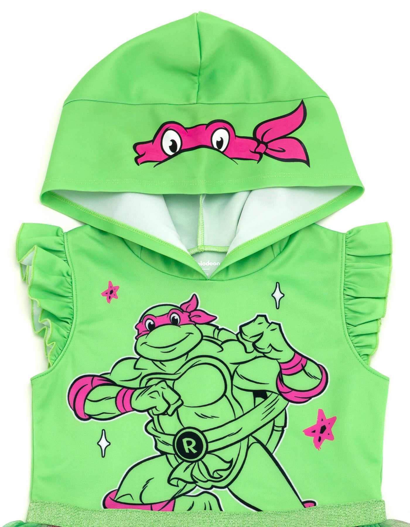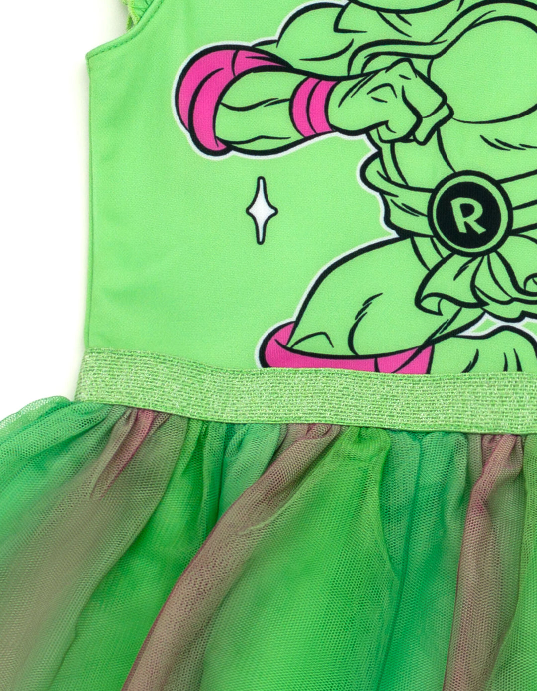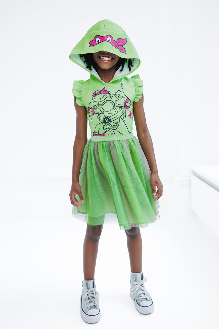 Get ready for an exciting crime-fighting adventure in this stylish Teenage Mutant Ninja Turtles outfit! This cute sleeveless tutu dress features an obre colored tulle ballerina skirt, pretty ruffle sleeves, and vibrant artwork of Raphael with a cool cosplay hood design! Made of a soft material that keeps your little girl comfortable, this fashionable TMNT hooded dress is perfect for your comic book fan!